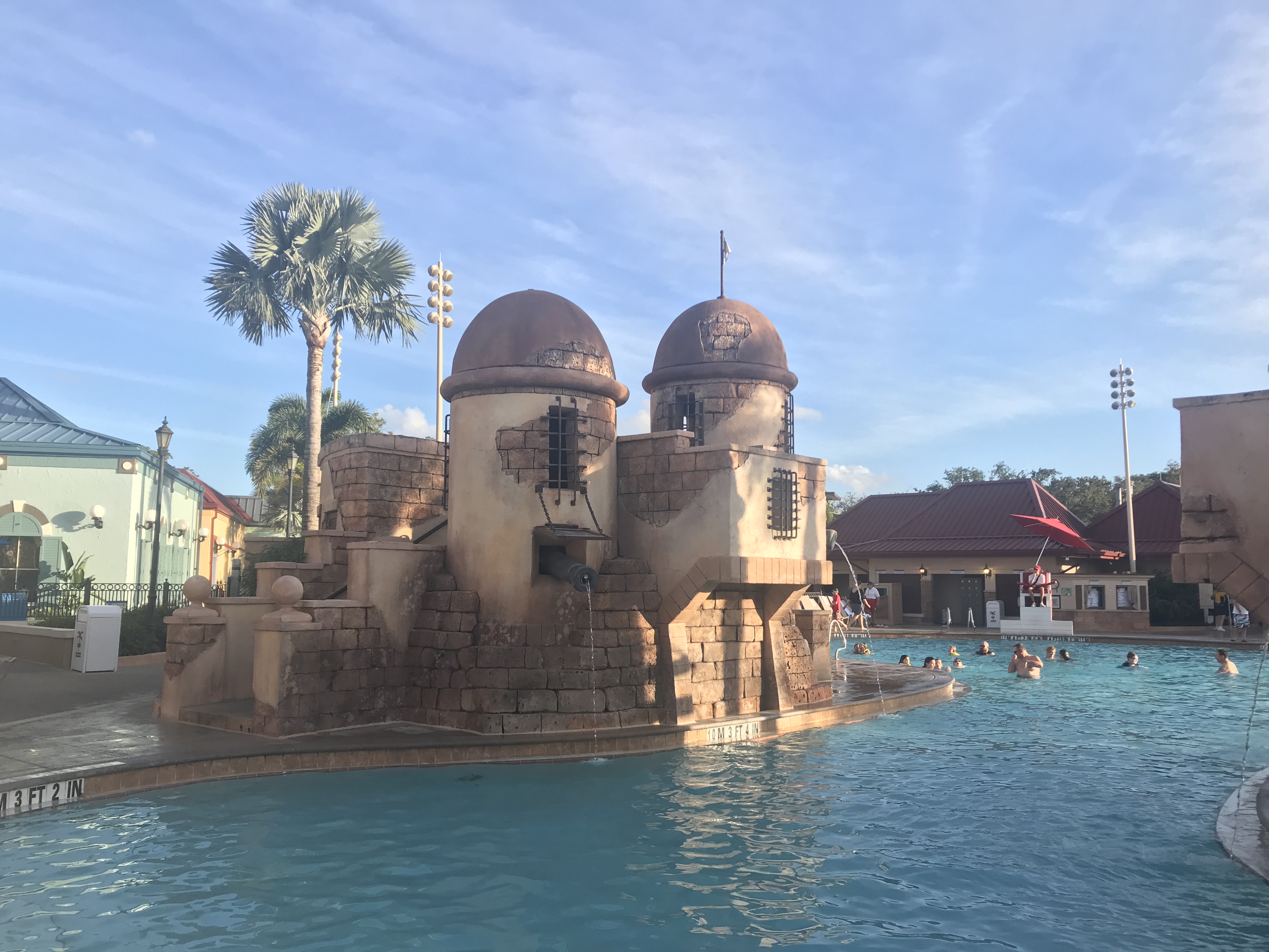 Caribbean Beach tries to capture the feel of five different Caribbean islands. Overall, it is hard to transmit the theme throughout each at such a large scale. The bright colors of the buildings bring some touches of the Caribbean while the pool actually feels a little out of place. The Spanish citadel might actually belong better to Coronado Springs. It does fit in with the Pirates of the Caribbean rooms, however.