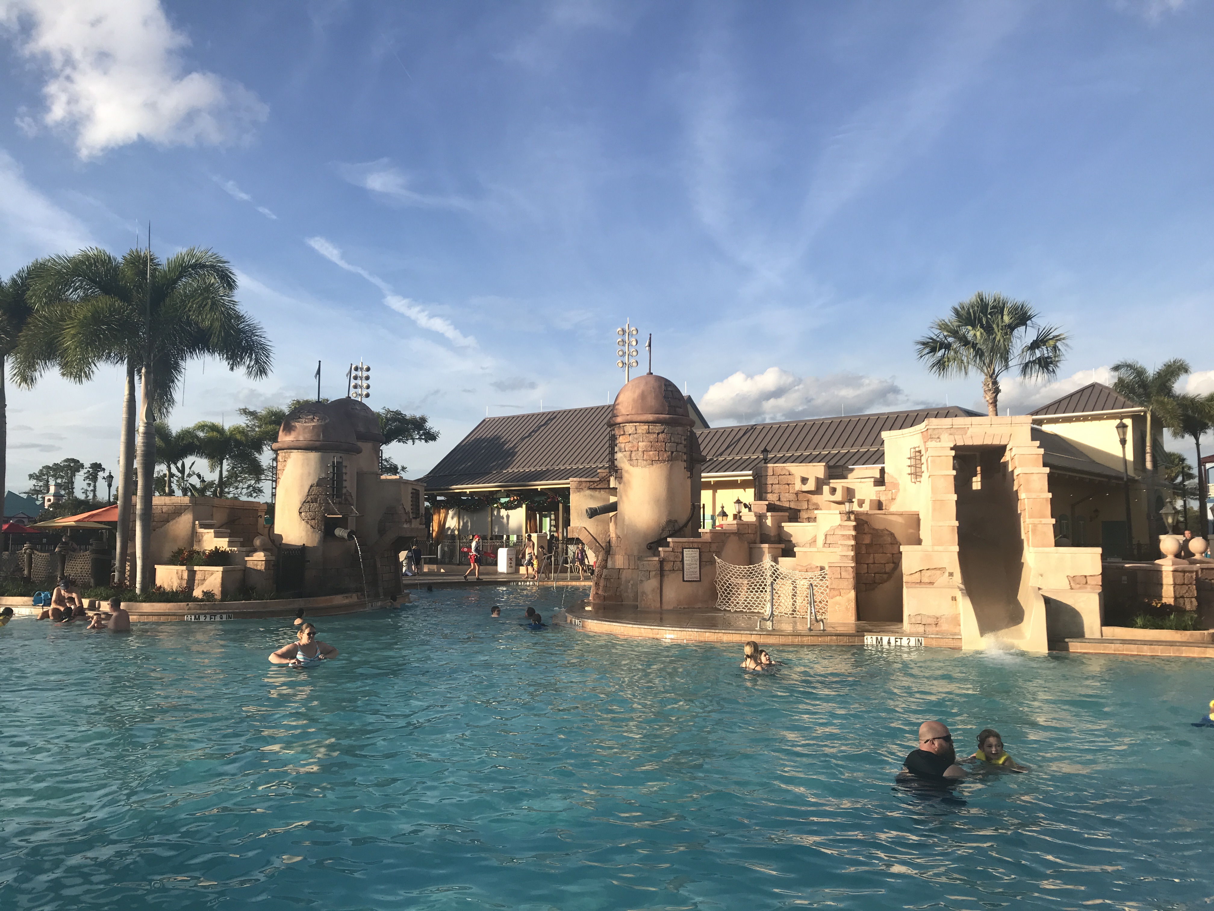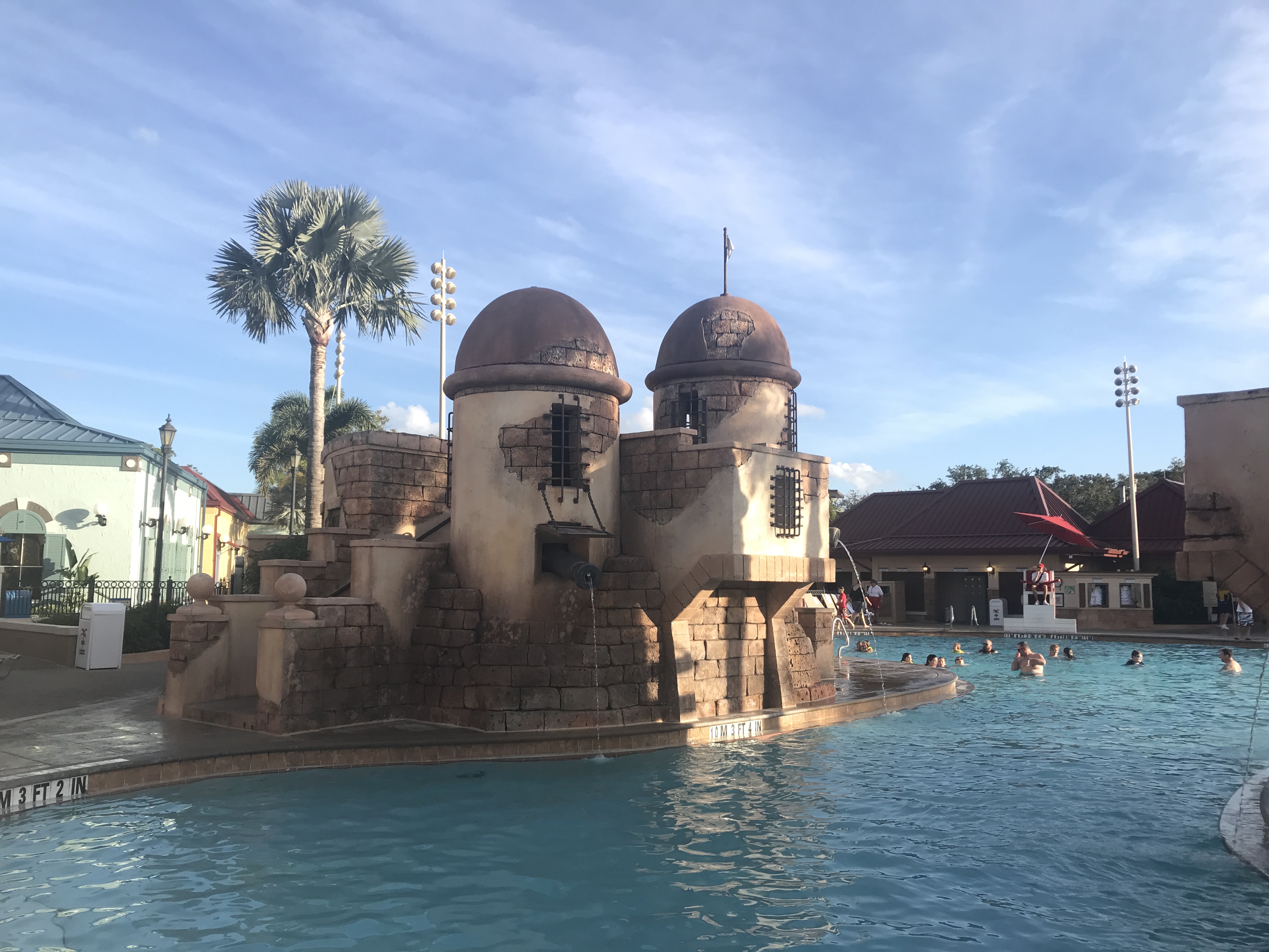 The main pool and recreation area at Caribbean Beach’s are truly the jewel of this resort, putting it squarely on the list for best Disney resort pools. A big benefit of the size of the resort is that the Fuentes del Moro pool area is equally as large. The theming follows along with a Pirate’s of the Caribbean with a Spanish Fort taking center stage.