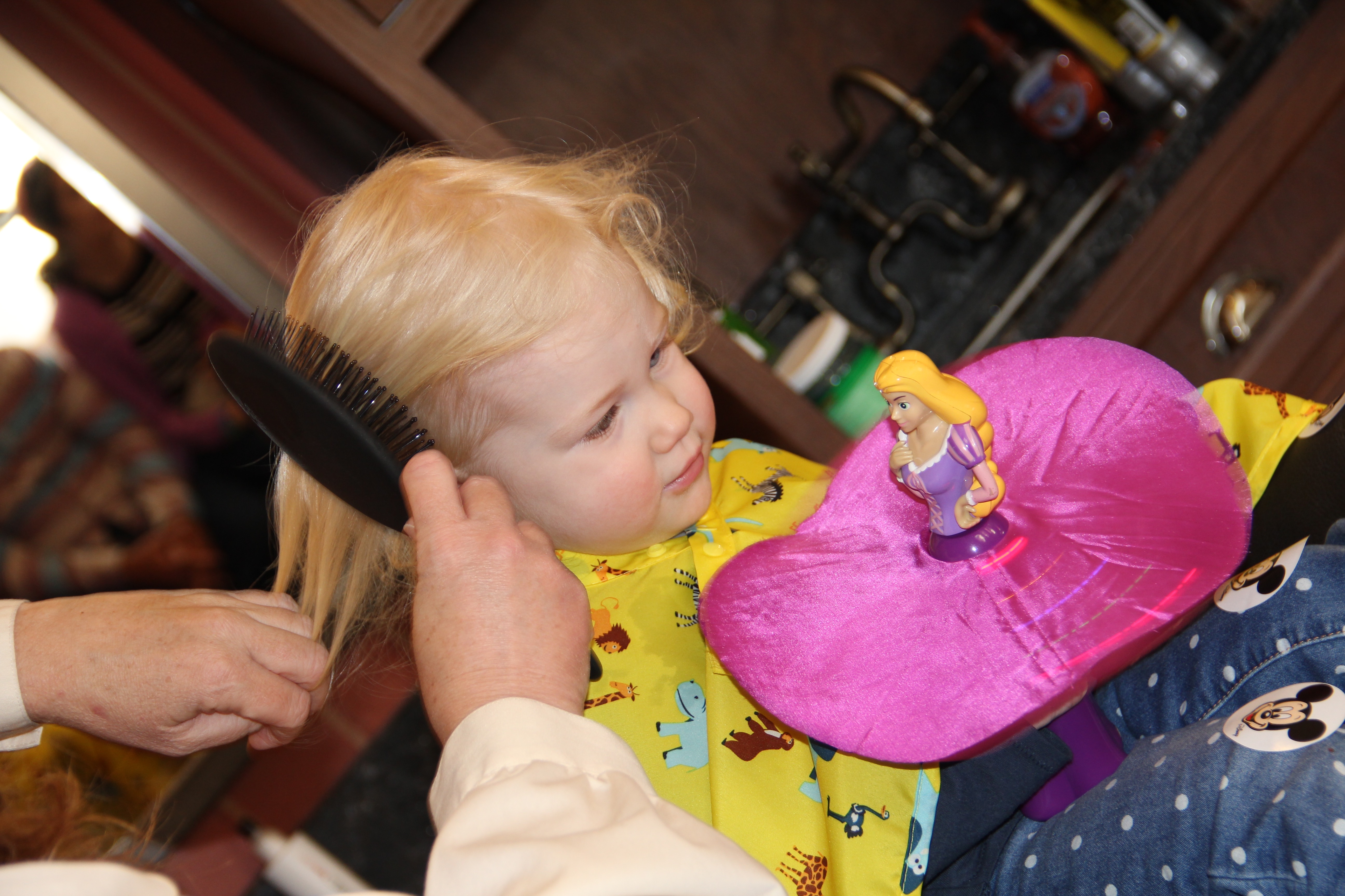 The spinning toys are consistent from cut to cut. We’ve had all different varieties, but Minnie Mouse and Rapunzel get to claim the “first haircut” spot!