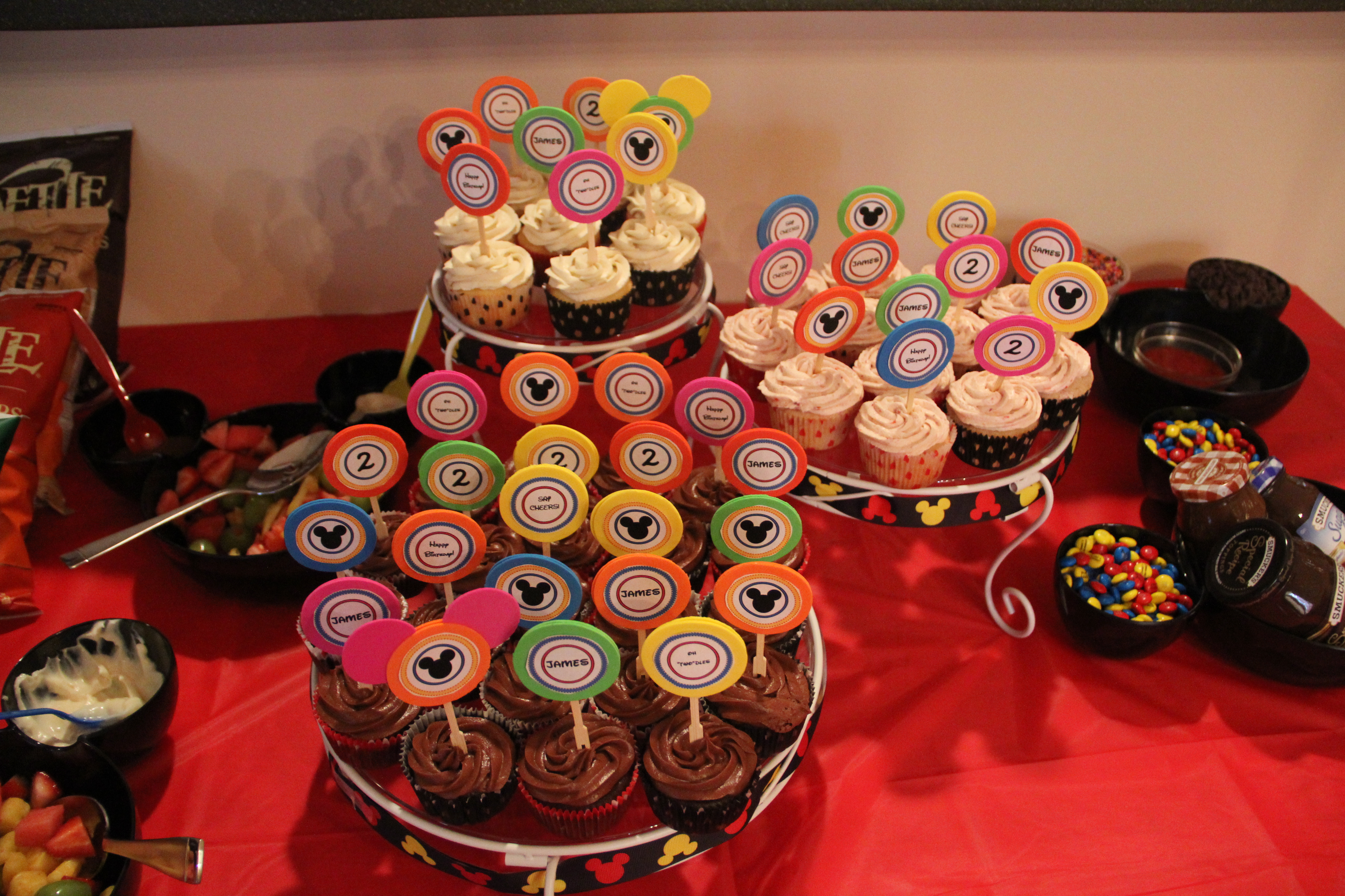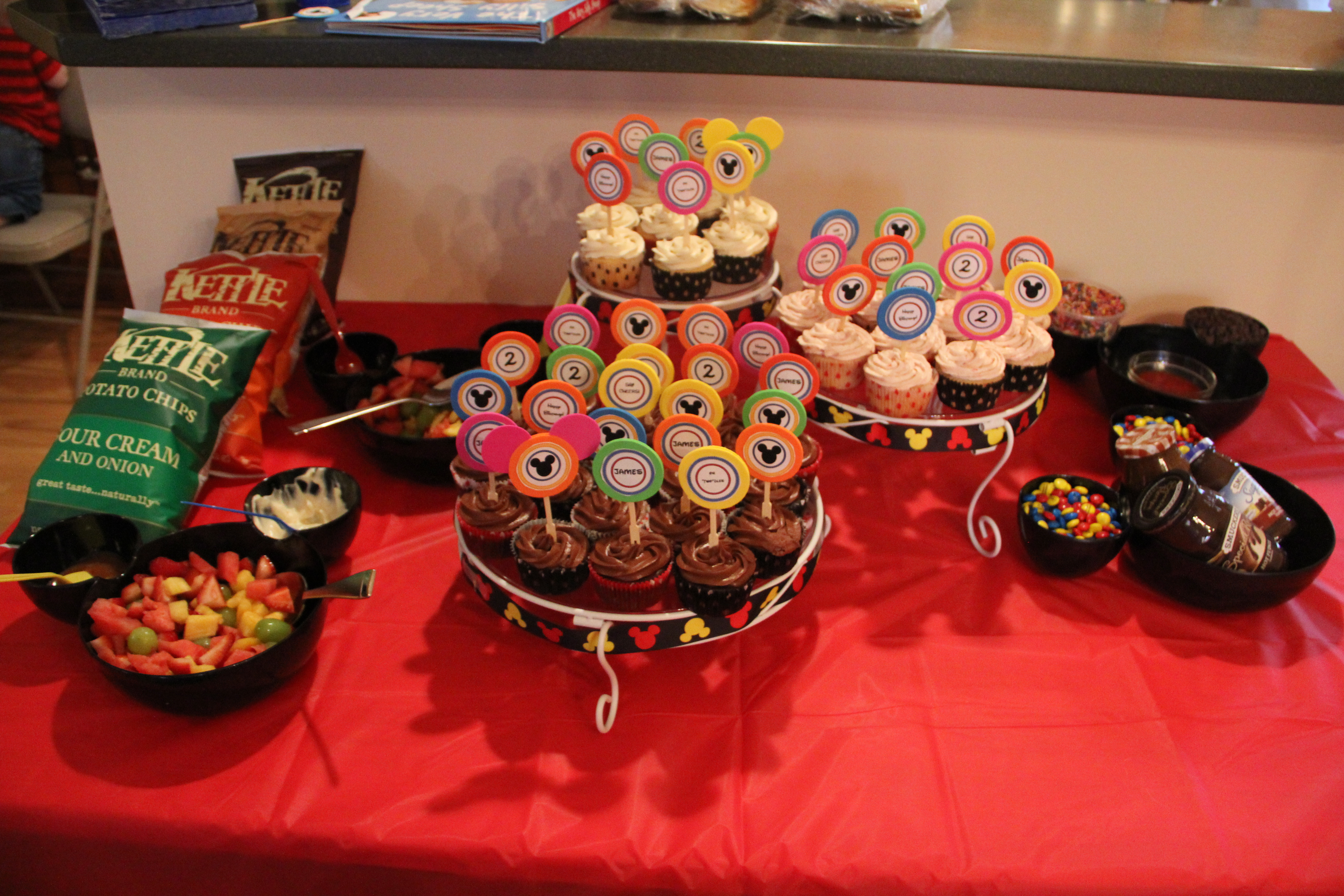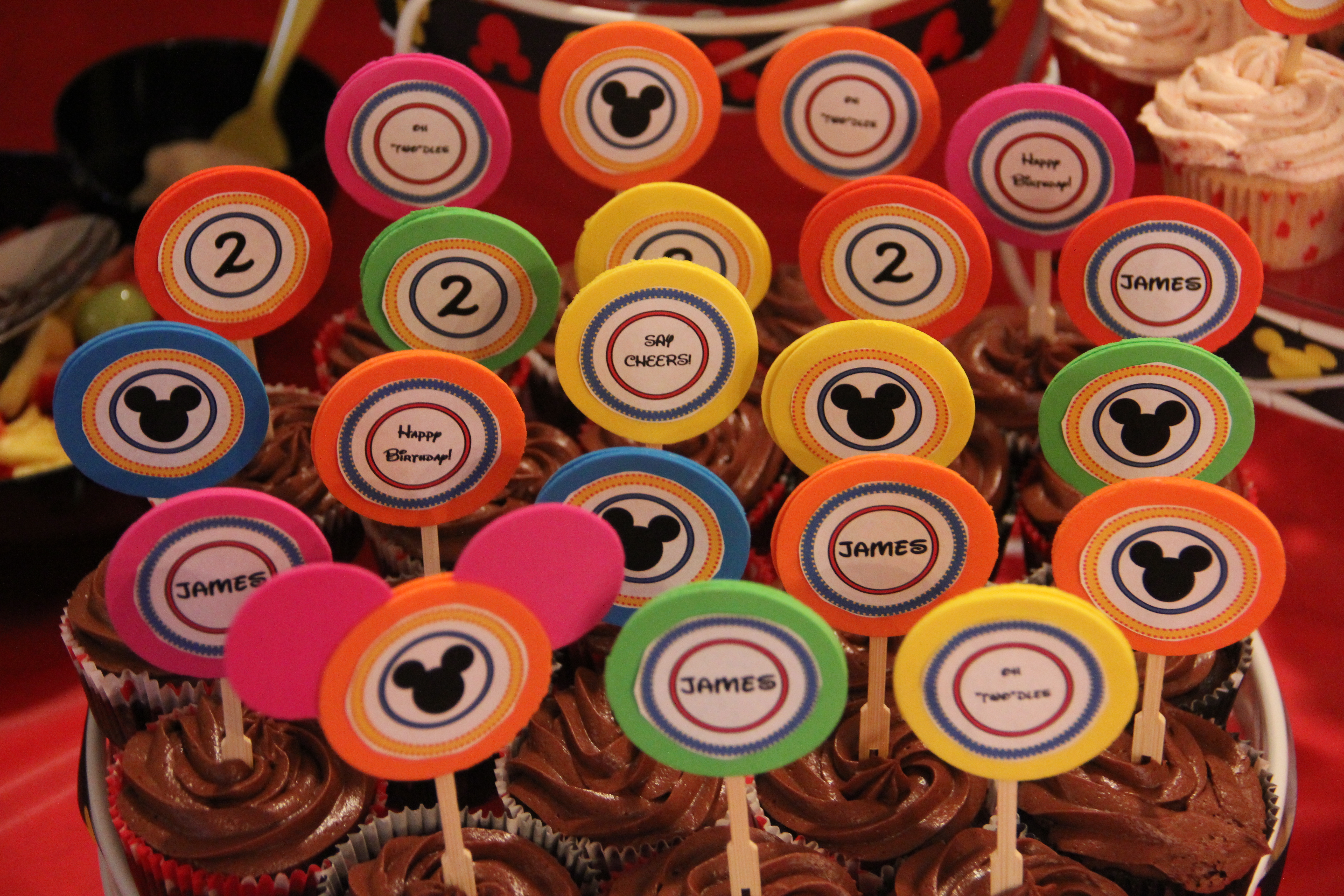 My final party favor were the cupcake toppers. I drew some inspiration from Etsy and created them myself. Using Microsoft Word, I created three circles and printed them in a few different ways. I used typical phrases from Mickey Mouse Club House, my son’s name, and his age. I bought a circular punch and punched out different colors of foam. Then I glued the different sayings to them. Finally, I glued two of the foam circles around a toothpick to make my cupcake toppers.