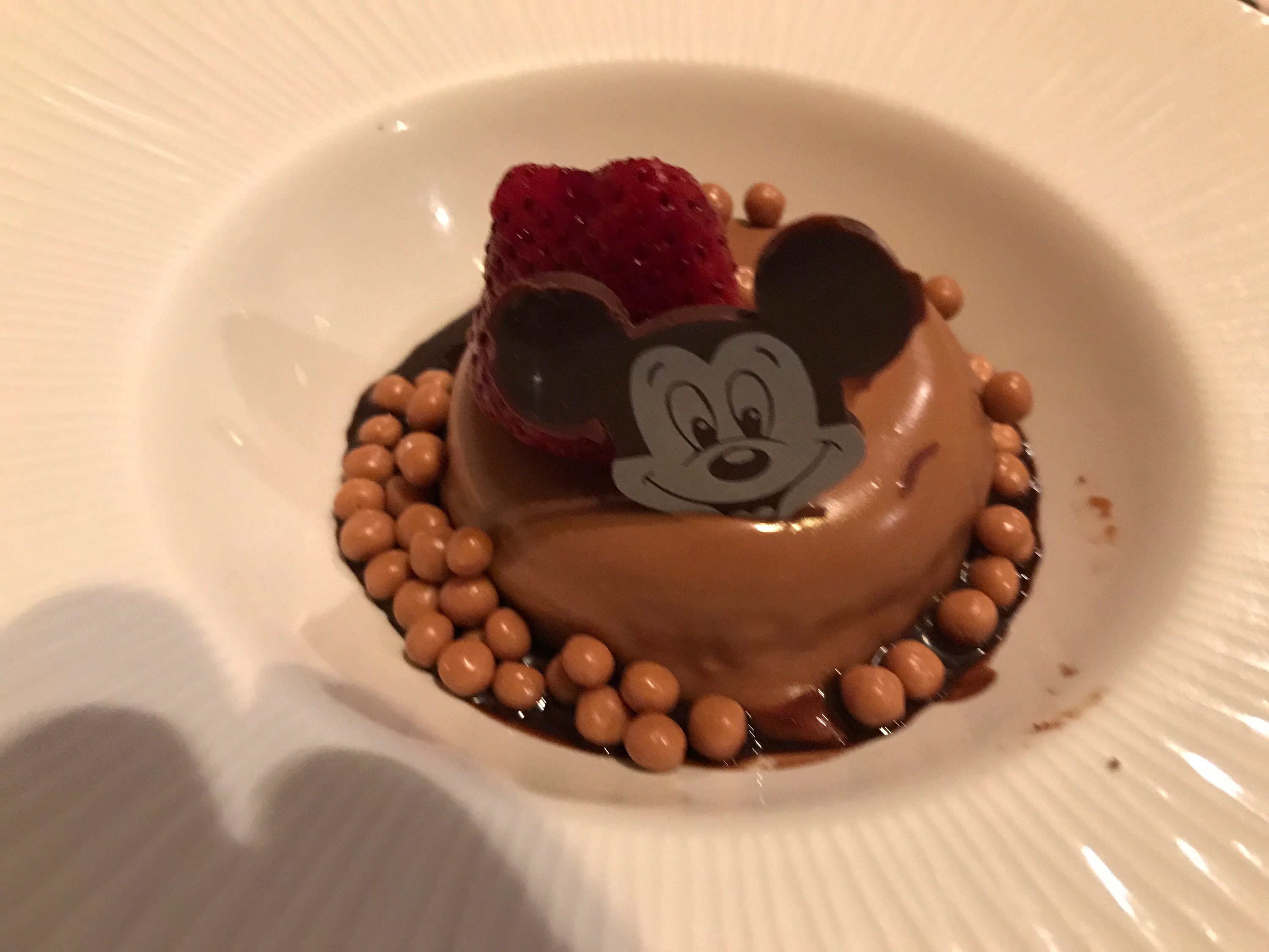 The other deserts we shared included the Sorbet Tasting and Lime Cheesecake. I actually thought the Caramel-Chocalate Cake from the Kids’ menu was a great adult desert. It has chocolate “lava” in the middle and a cute Mickey chocolate nib.