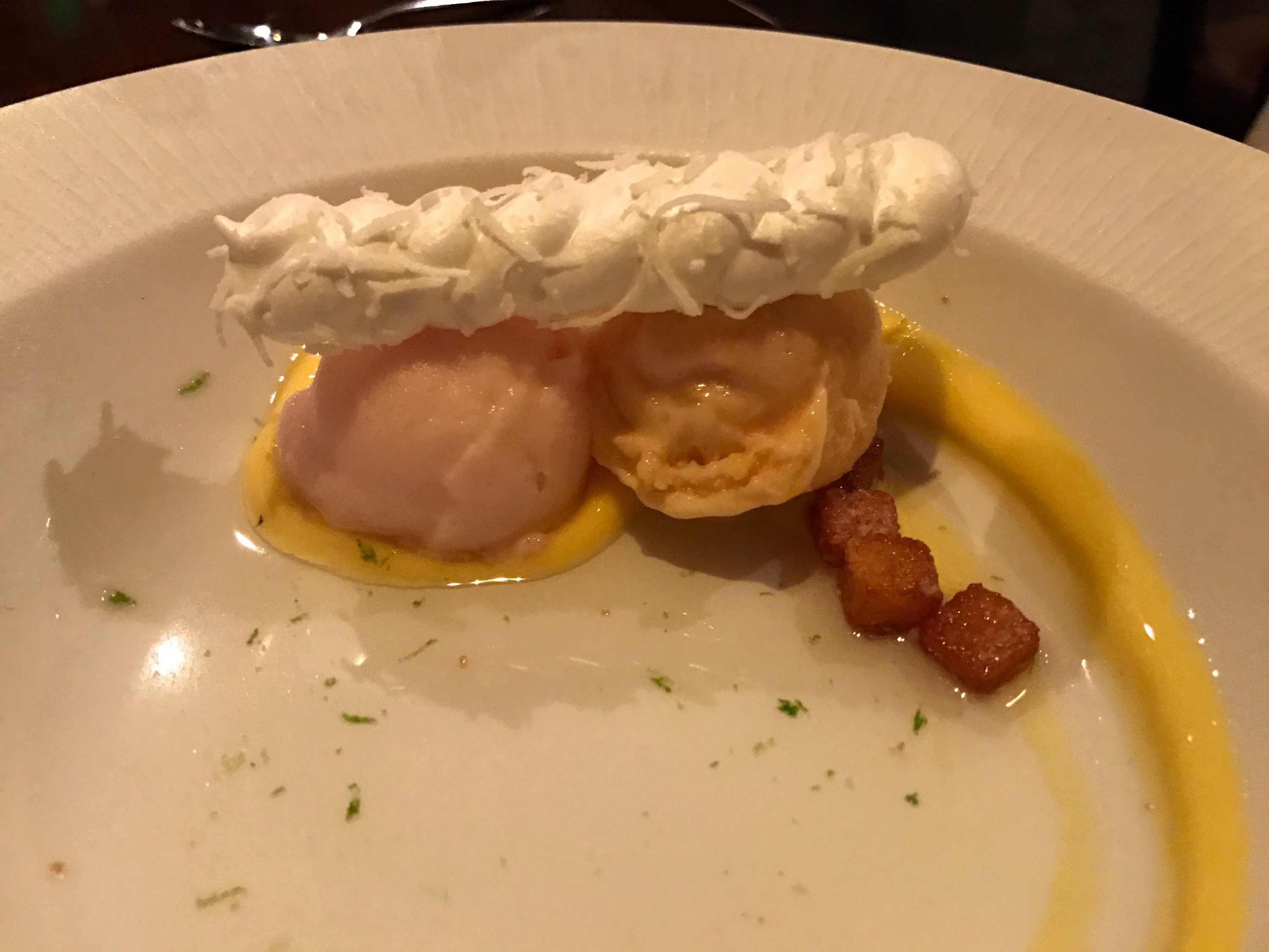 I had the Duo of Lamb, which seems to alternate with the Duo of Venison on the menu. It was a delicious Lamb sausage and lamb loin served with Leek ashes. I thought they were for decoration at first but actually added quite a bit to the flavor. Again, medium-rare was the way to go.